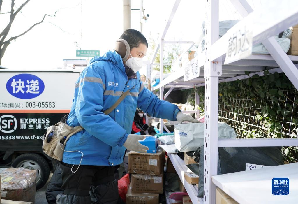 11月29日,在北京市海淀區中關村街道一處快遞點,快遞員在寒風中整理快遞。