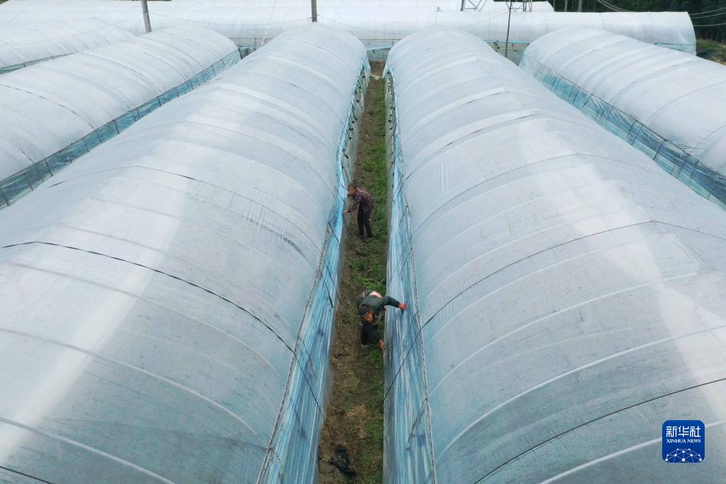 11月29日,在貴州省黔南布依族自治州都勻市勻東鎮大坪村草莓種植基地,農戶覆蓋大棚保溫膜,做好抵御寒潮的準備工作(無人機照片)。