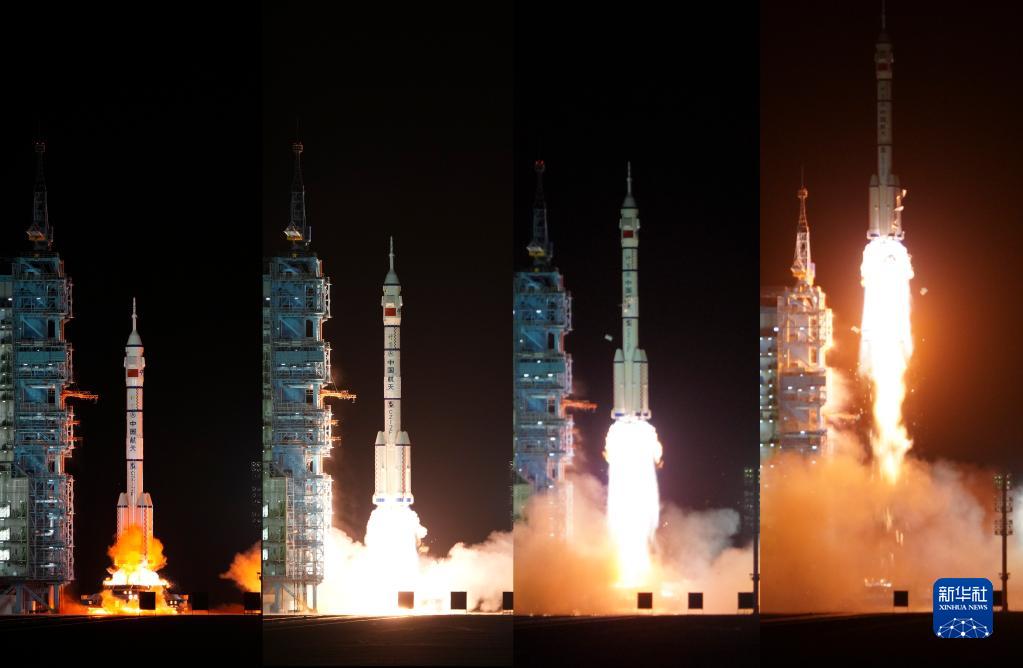 11月29日23時08分,搭載神舟十五號載人飛船的長征二號F遙十五運載火箭在酒泉衛星發射中心點火發射,約10分鐘后,神舟十五號載人飛船與火箭成功分離,進入預定軌道,航天員乘組狀態良好,發射取得圓滿成功(拼版照片)。新華社記者 李剛 攝