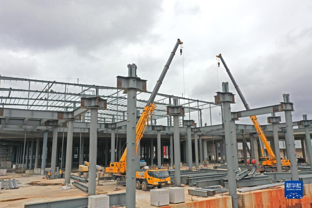施工車輛在中新南寧國際物流園的電商物流園進行頂棚施工(11月29日攝,無人機照片)。