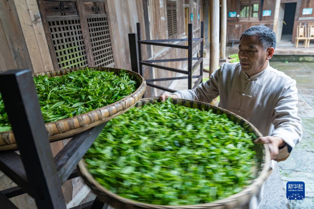 在四川省雅安市名山區的張氏祖屋,張躍華用傳統方式攤晾新采摘的鮮葉(2022年3月31日攝)。蒙山茶產于四川省雅安市名山區境內的蒙頂山,是綠茶的一種。張躍華,生于1959年,是國家級非物質文化遺產代表性項目——綠茶制作技藝(蒙山茶傳統制作技藝)的代表性傳承人。張躍華自幼隨父親學習蒙山茶傳統制作技藝,是“張氏甘露”第五代傳人,他每年都要招收年輕徒弟,希望蒙山茶傳統制作技藝能世世代代傳承下去。