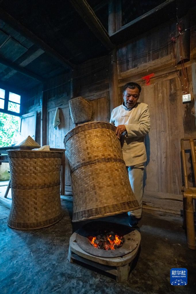 在四川省雅安市名山區的張氏祖屋,張躍華用傳統方式烘焙茶葉(2022年3月31日攝)。蒙山茶產于四川省雅安市名山區境內的蒙頂山,是綠茶的一種。張躍華,生于1959年,是國家級非物質文化遺產代表性項目——綠茶制作技藝(蒙山茶傳統制作技藝)的代表性傳承人。張躍華自幼隨父親學習蒙山茶傳統制作技藝,是“張氏甘露”第五代傳人,他每年都要招收年輕徒弟,希望蒙山茶傳統制作技藝能世世代代傳承下去。