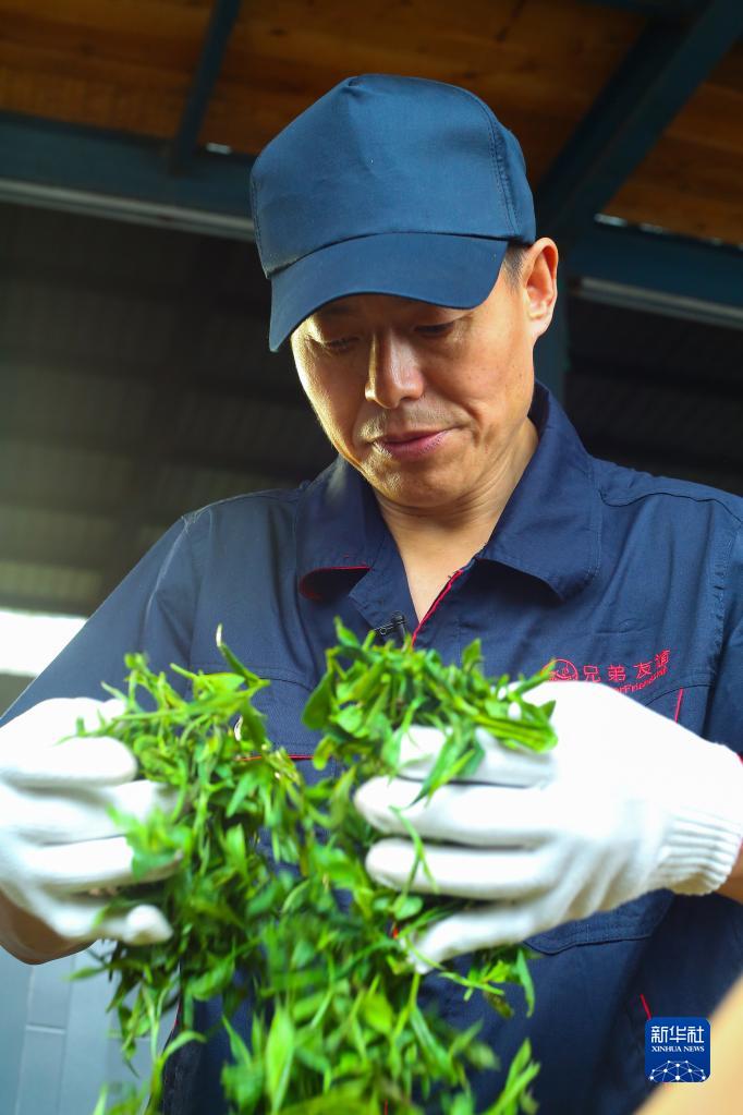 在四川省雅安市友誼茶葉有限公司的生產車間,甘玉祥在用傳統方式炒茶(2019年7月19日攝)。南路邊茶是黑茶的一種,產于四川省雅安市,又稱“邊銷茶”“南邊茶”“藏茶”等。甘玉祥,生于1963年,是國家級非物質文化遺產代表性項目——黑茶制作技藝(南路邊茶制作技藝)的代表性傳承人。他從小隨父親學習制作南路邊茶,希望通過不懈努力,讓南路邊茶被更多人飲用和喜愛。