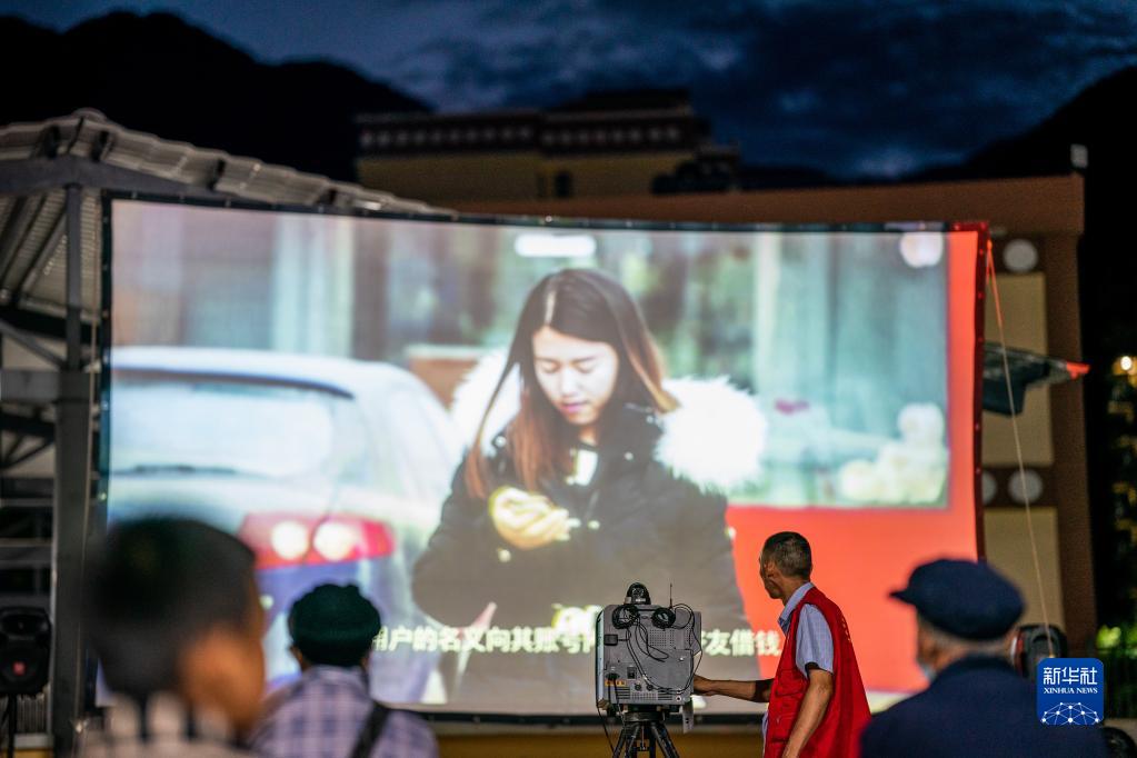 楊明金在怒江州瀘水市一個搬遷點播放科教片(2022年10月23日攝)。
