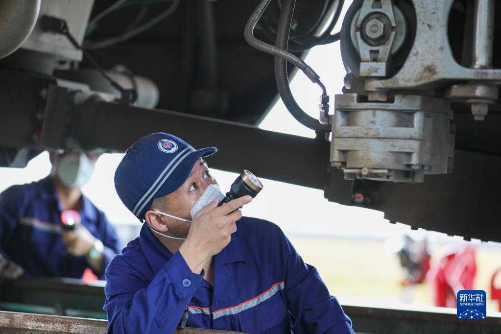 8月1日,在老撾首都萬象,中老鐵路雙方員工共同檢修列車。