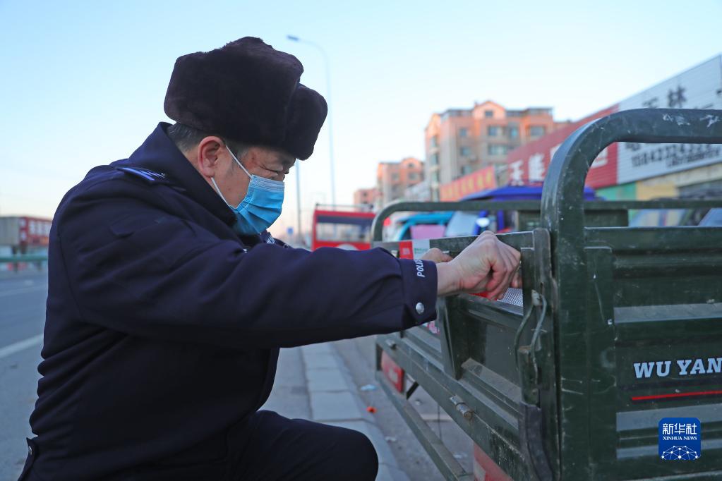 12月1日,沈陽市公安局交通警察局蘇家屯大隊交警給農用三輪車粘貼反光條。