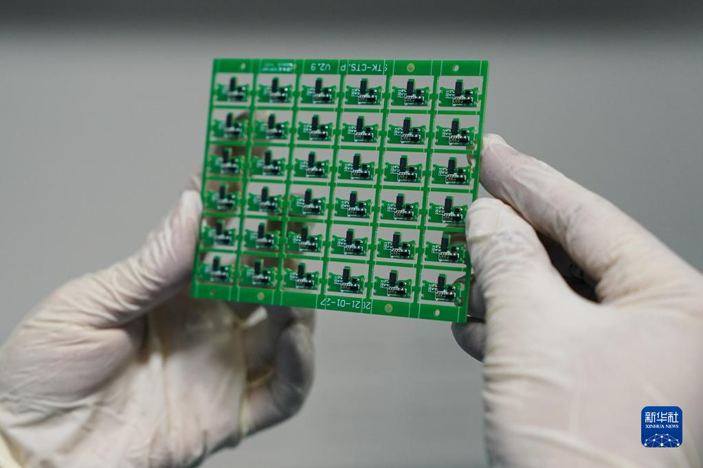 11月30日,在安徽省蚌埠市希磁科技有限公司,工作人員展示一款智能傳感器控制芯片。