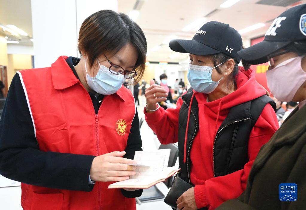 12月1日,工作人員(左)為到福州市政務服務中心辦理養老保險的退休老人解答有關辦理程序。