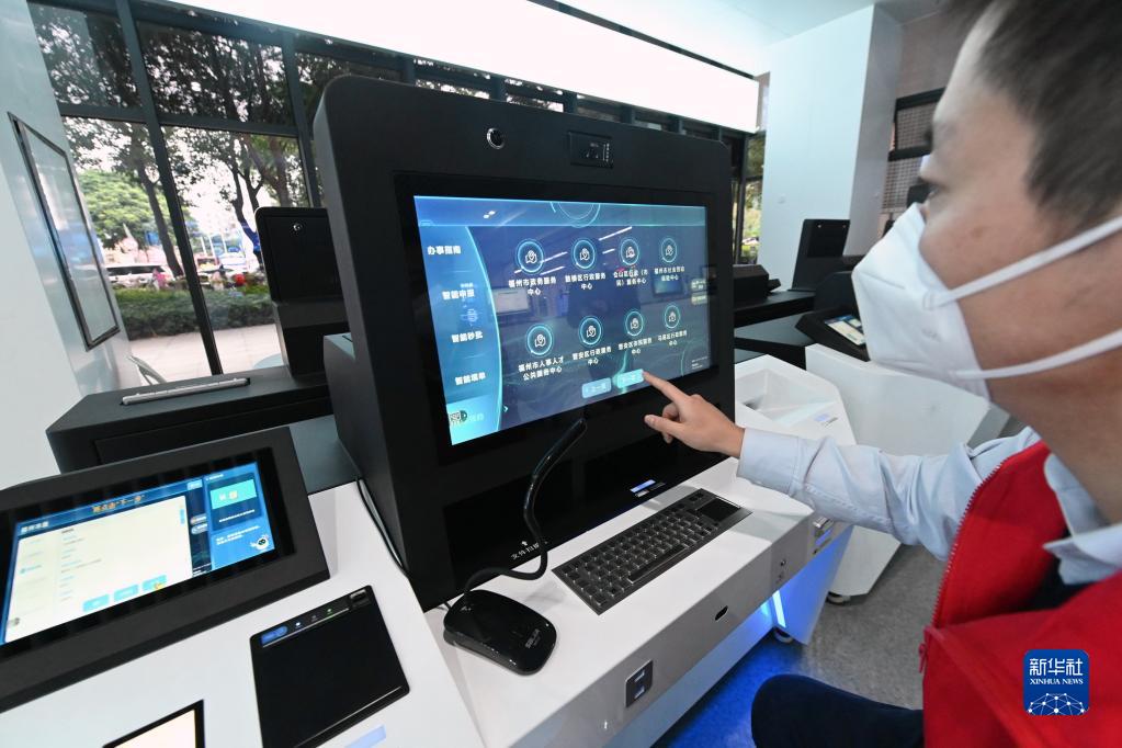 12月1日,志愿者在福州市政務服務中心介紹該市創新推出的首批智能“秒報”事項服務的“榕e辦”智能終端的情況。