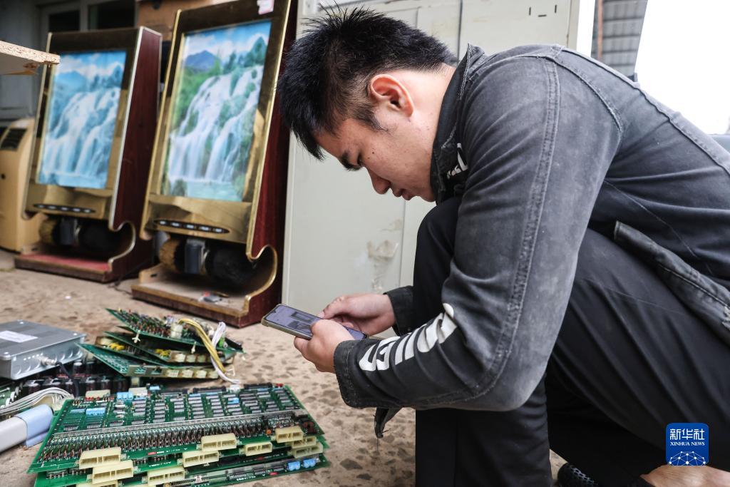 12月1日,海南殘服再生資源有限公司員工王琪祥用手機在線上銷售舊物。