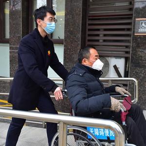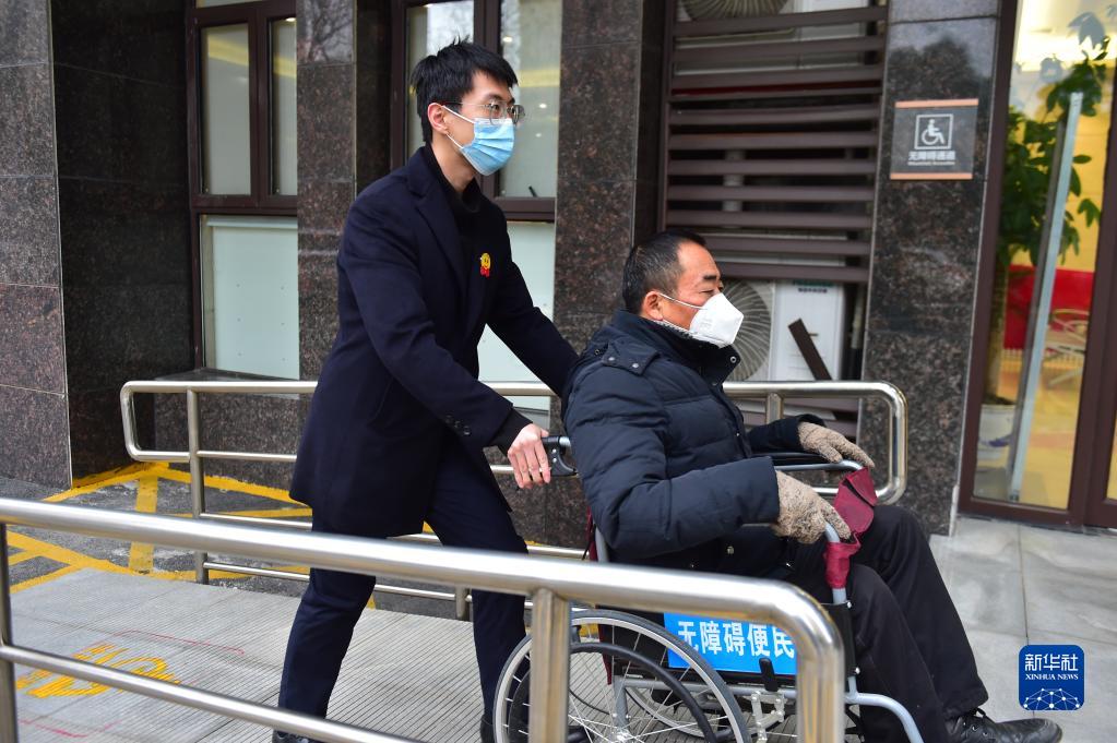 江西省南昌市紅谷灘區市民中心的工作人員推著市民劉順保通過無障礙通道前往中心大廳(12月2日攝)。
