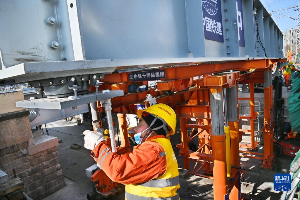 12月5日,中鐵十四局建設者在對青島海岸路鋼梁橋進行鋼梁更換作業。