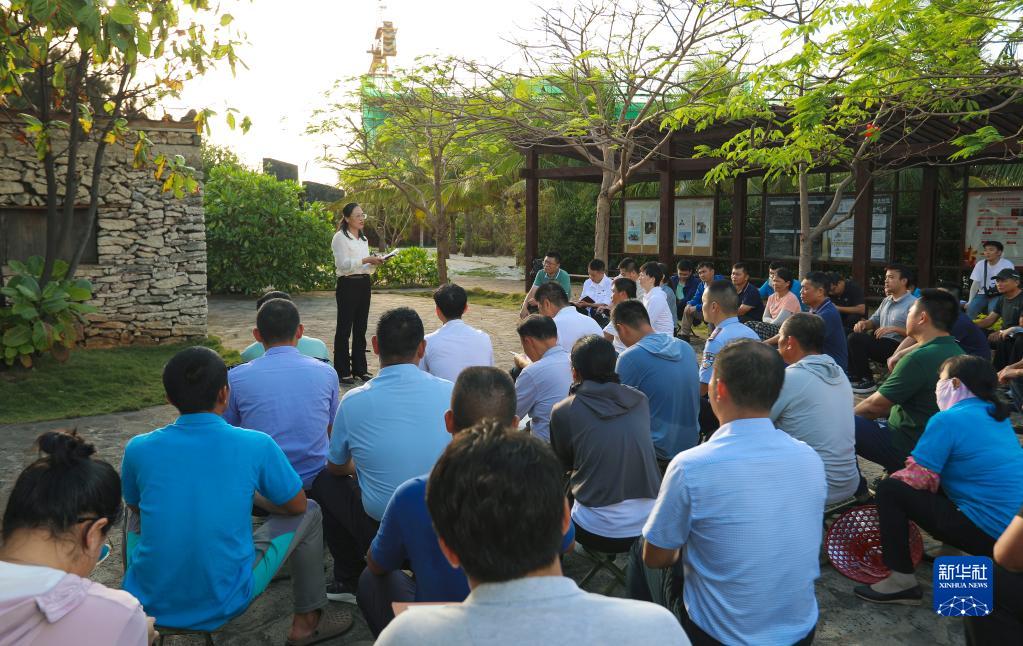 11月17日,黨的二十大代表、海南陵水黎族自治縣文羅鎮副鎮長、五星村黨總支書記黃麗萍在三沙市趙述島宣講黨的二十大精神。新華社發(吳亞鐵攝)