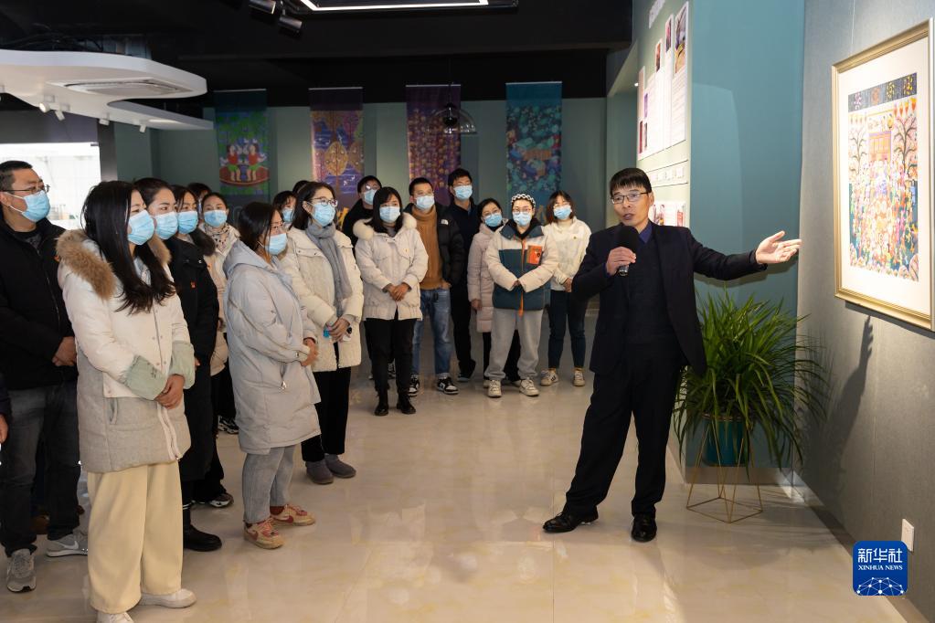 12月4日,江蘇省南京市六合區農民畫美術館內,一場以江蘇省非物質文化遺產六合農民畫為載體的黨的二十大精神宣講會舉行。這是六合區冶山街道文體服務中心主任胡斌(右一)帶領參加活動的基層干部群眾參觀農民畫。新華社發 (張夢 攝)