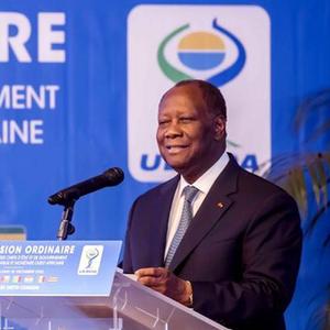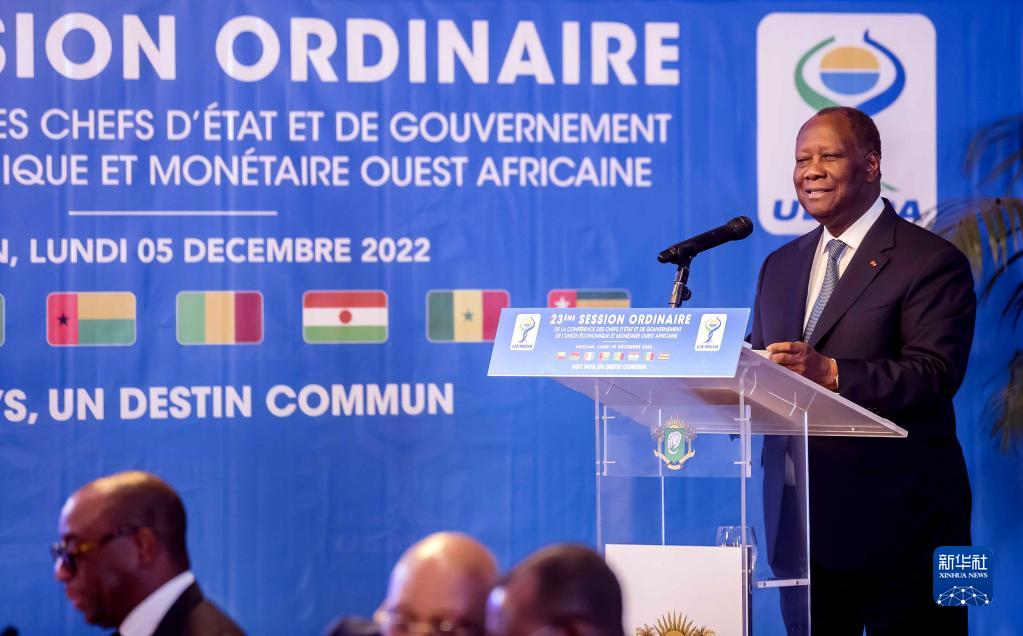 12月5日,在科特迪瓦經濟首都阿比讓,科特迪瓦總統瓦塔拉在西非經濟貨幣聯盟第23屆國家元首和政府首腦會議上講話。