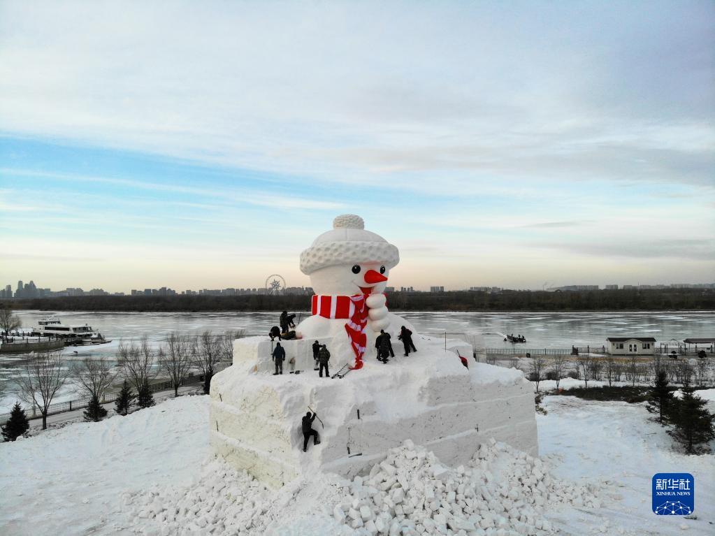 12月6日,工人在松花江哈爾濱段江畔搭建巨型雪人(無人機照片)。
