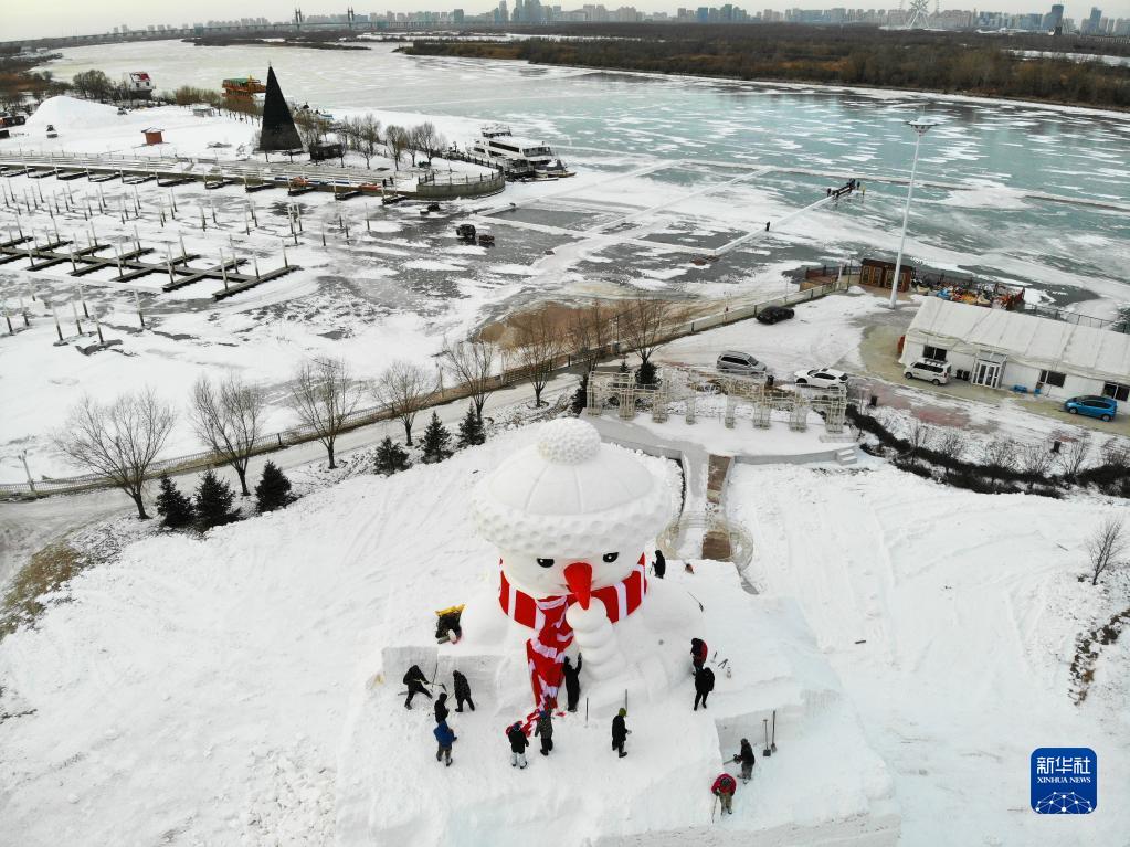 12月6日,工人在松花江哈爾濱段江畔搭建巨型雪人(無人機照片)。