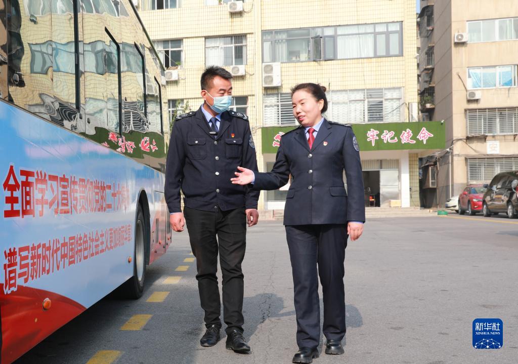 熊會萍(右)與同事交流(11月1日攝)。新華社發(襄陽市公交集團供圖)