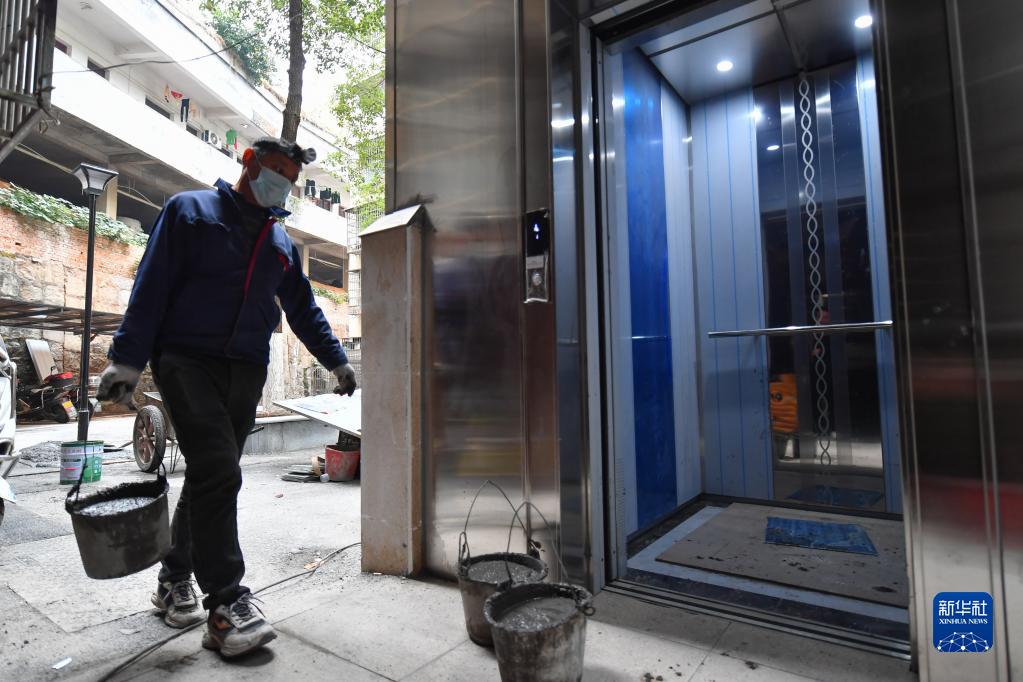 12月7日,在長沙市天心區裕南街街道長坡社區木材廠宿舍,工人準備乘坐電梯上樓施工。