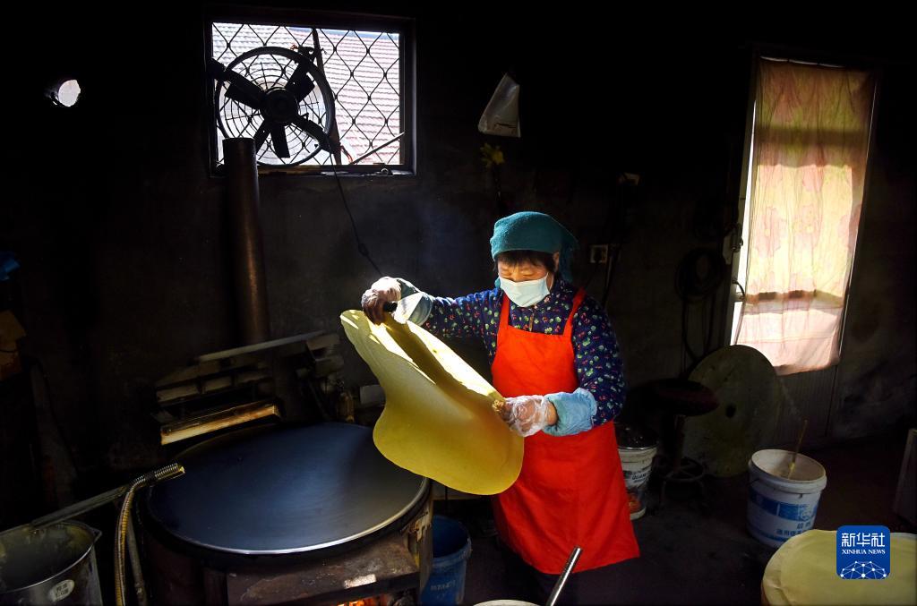 12月6日,山東省淄博市沂源縣石橋鎮葛莊村的村民在加工煎餅。