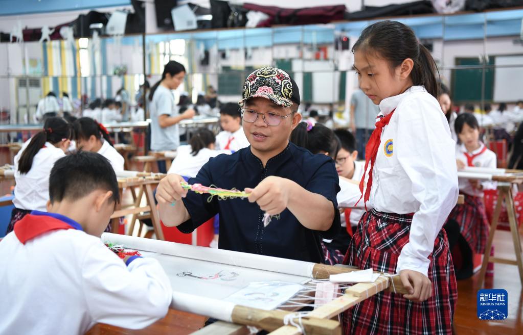 在廣州市荔灣區康有為紀念小學的廣繡課堂,王新元在指導學生(10月12日攝)。