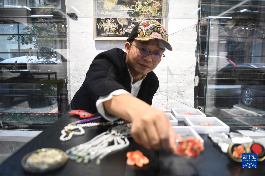在廣州市荔灣區的工作室,王新元在擺放廣繡文創產品(12月6日攝)。