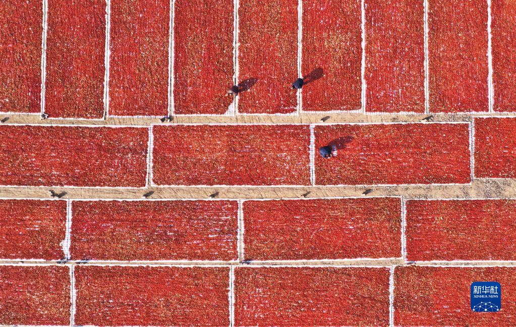12月7日,在安徽省亳州市譙城區華佗鎮黃莊村,藥農在晾曬中藥材梔子(無人機照片)。