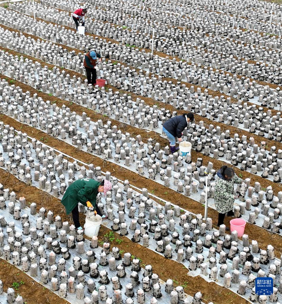 12月7日,在湖南省永州市道縣壽雁鎮黑木耳種植基地,村民在采摘黑木耳(無人機照片)。
