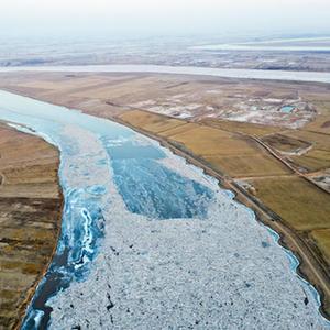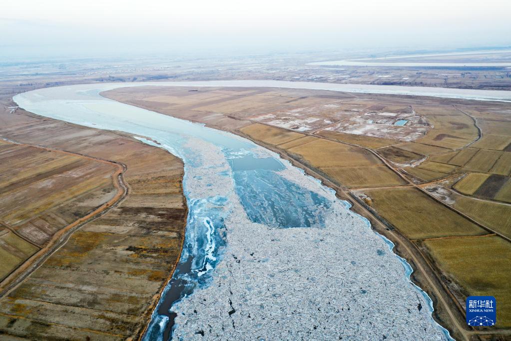 12月7日拍攝的內蒙古鄂爾多斯市達拉特旗冰封黃河景象(無人機照片)。
