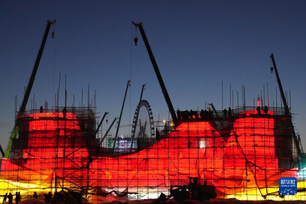 12月7日,施工人員在哈爾濱冰雪大世界園區施工作業。