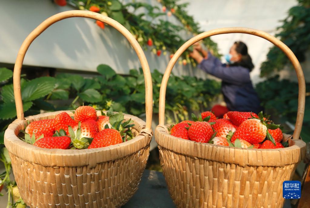 12月8日,山東省青島市即墨區段泊嵐鎮即發農業基地的農民在采摘草莓。