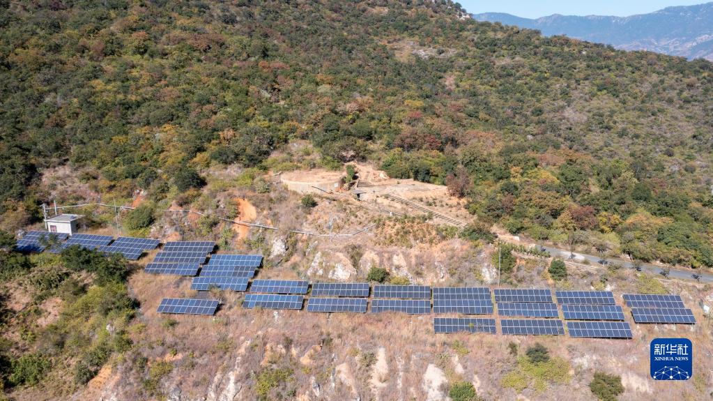 這是11月28日在攀枝花蘇鐵國家級自然保護區內拍攝的光伏板(無人機照片)。保護區通過光伏板儲能抽水,用于植物灌溉。