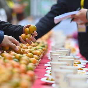 12月9日,在融安縣金桔擂臺賽現場,評委對參賽金桔進行綜合評比。
