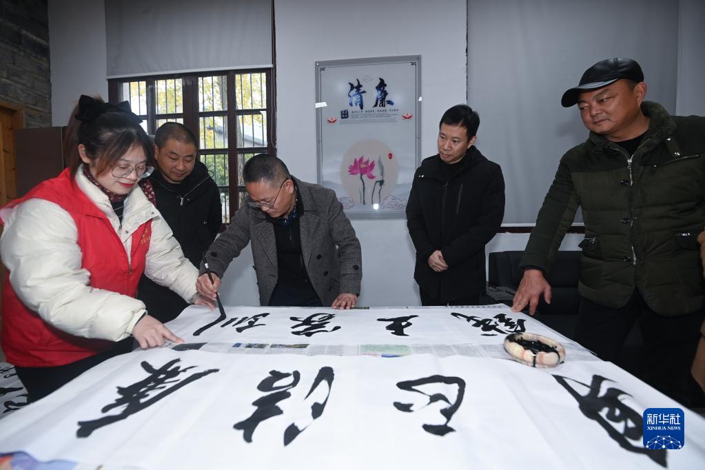 12月9日,杭州市臨安區太陽鎮上莊村村民在觀看書法愛好者現場書寫以“廉潔家風”為主題的書法作品。