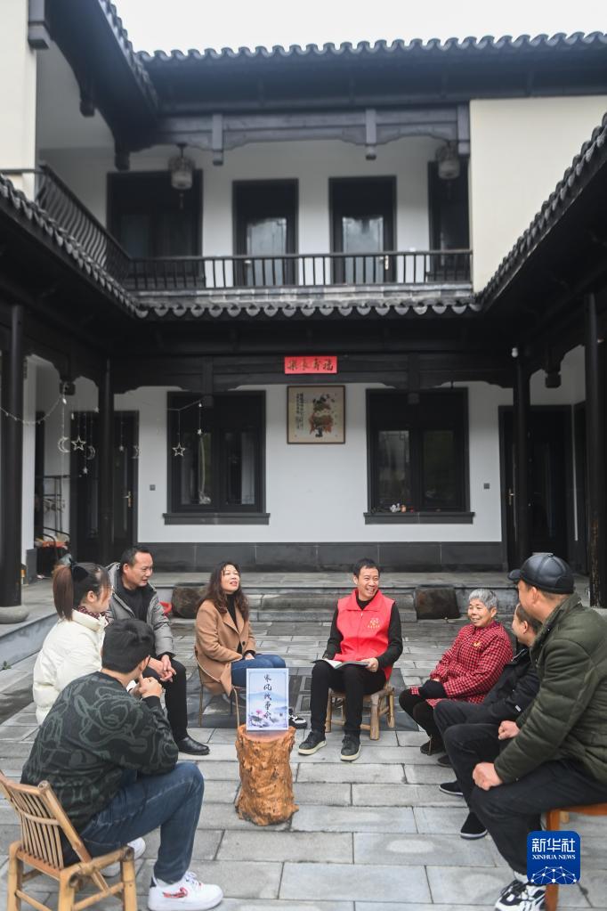 12月9日,在杭州市臨安區太陽鎮上莊村,黨員志愿者和村民們一起參加家風故事會。