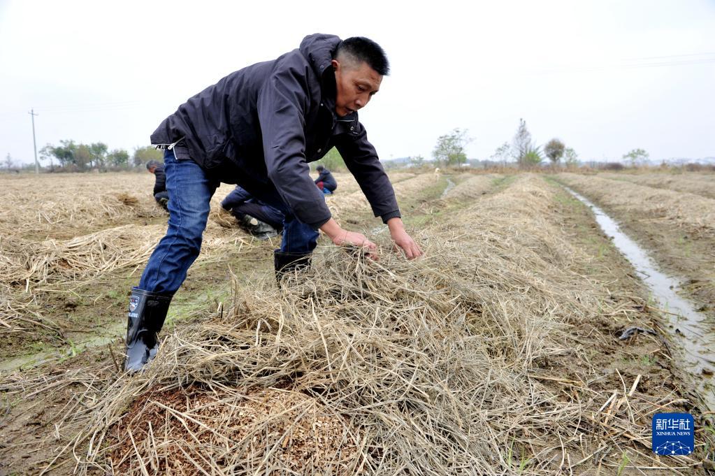 在江西省南昌市南昌縣幽蘭鎮,村民們在收割后的晚稻田里利用處理過的秸稈種植大球蓋菇(12月7日攝)。