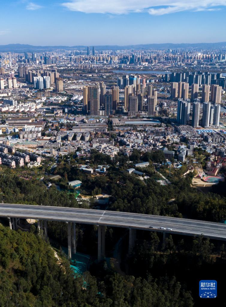 這是12月8日拍攝的新昆楚高速昆明入城段一景,遠處是昆明主城區(無人機照片)。新華社記者 陳欣波 攝