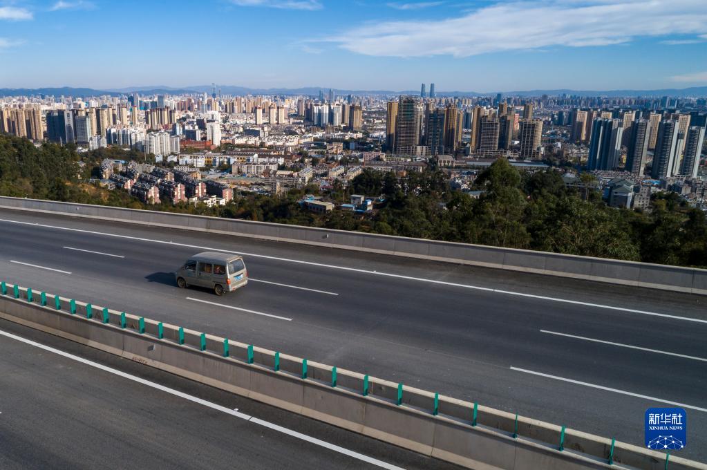 12月8日,一輛施工車輛在新昆楚高速昆明入城段行駛(無人機照片)。新華社記者 陳欣波 攝