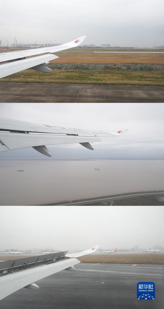 拼版照片:12月9日,國產大飛機C919在上海浦東國際機場的跑道上滑行,準備起飛(上圖);12月9日,國產大飛機C919在上海浦東國際機場起飛升空(中圖);12月9日,國產大飛機C919在上海虹橋機場落地(下圖)。