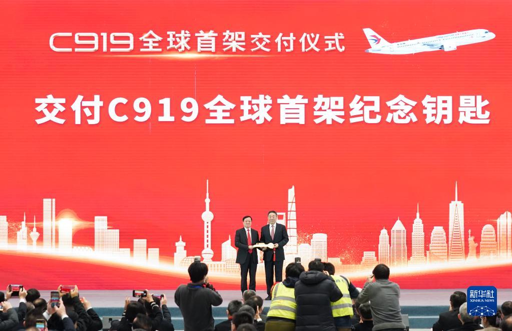 12月9日,在交付儀式現場,C919主制造商中國商飛向東航交付“C919全球首架紀念鑰匙”。