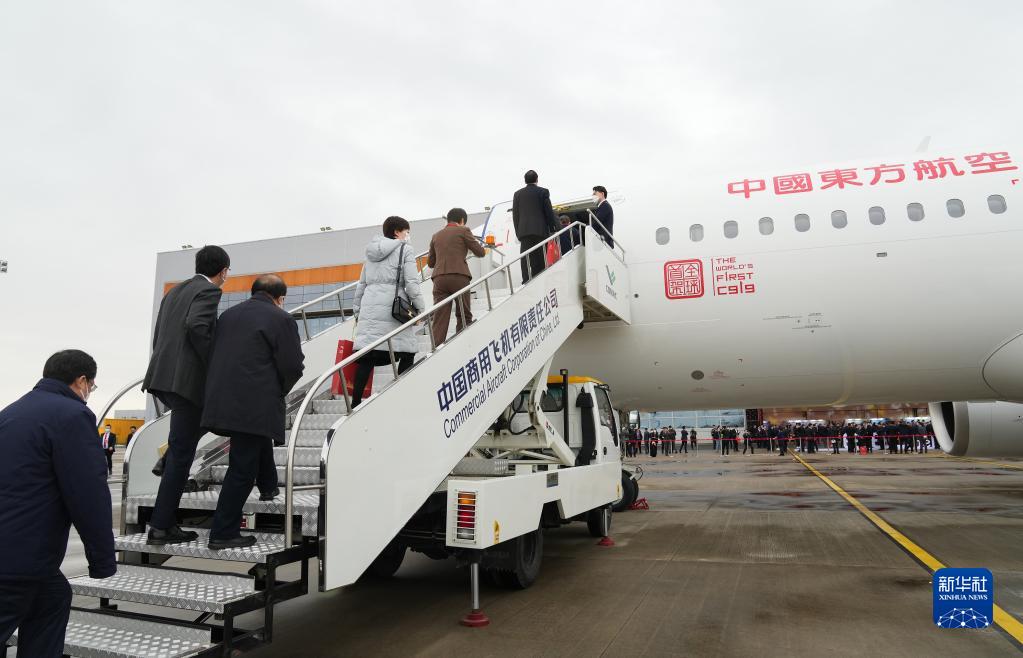 12月9日,國產大飛機C919準備從上海浦東飛往虹橋完成“首秀”飛行,乘客有序登機。