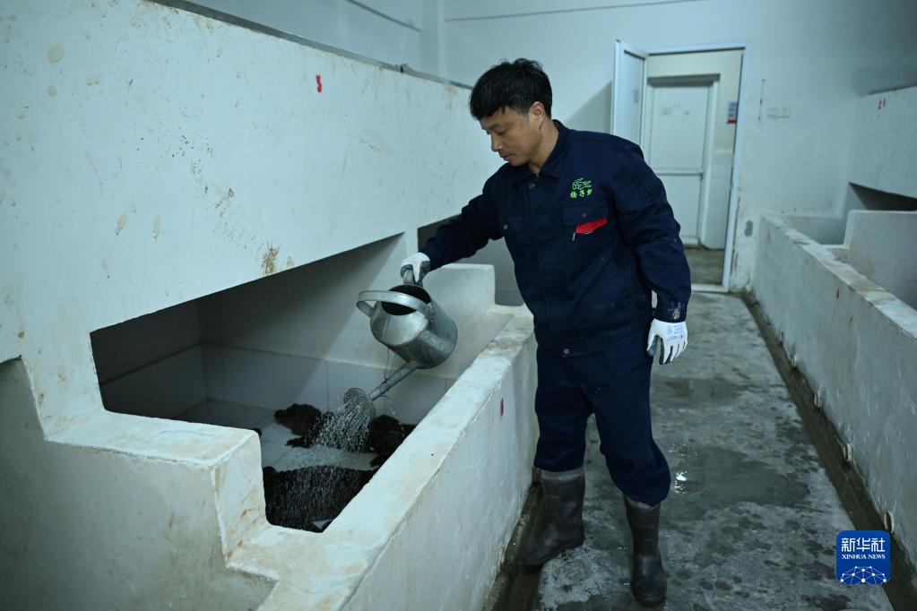 11月30日,在安徽揚子鱷國家級自然保護區夏渡片區越冬暖房中,工作人員對人工繁育的揚子鱷噴水增濕,幫助它們安然越冬。