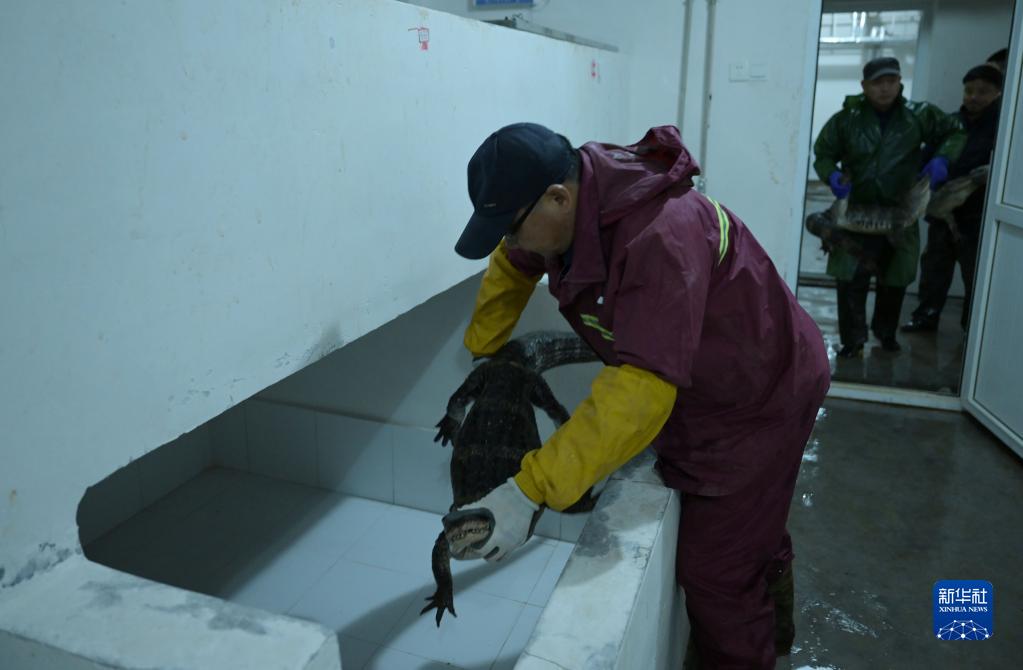 隨著天氣轉寒,位于安徽省宣城市的安徽揚子鱷國家級自然保護區夏渡片區開始對人工繁育的揚子鱷進行一年一度的越冬轉場。工作人員將揚子鱷從飼養池搬運至專門設置的越冬暖房冬眠,保證揚子鱷安全過冬。