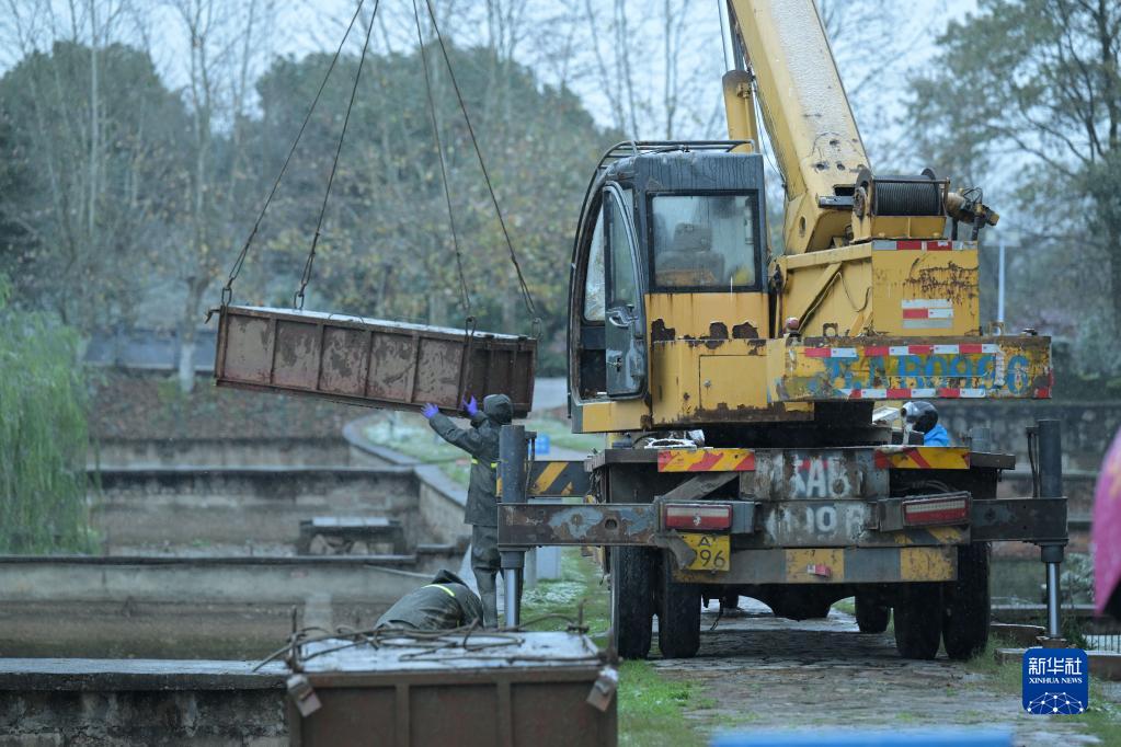 11月30日,在安徽揚子鱷國家級自然保護區夏渡片區,工作人員用吊車將人工繁育的揚子鱷裝箱轉移到越冬暖房。