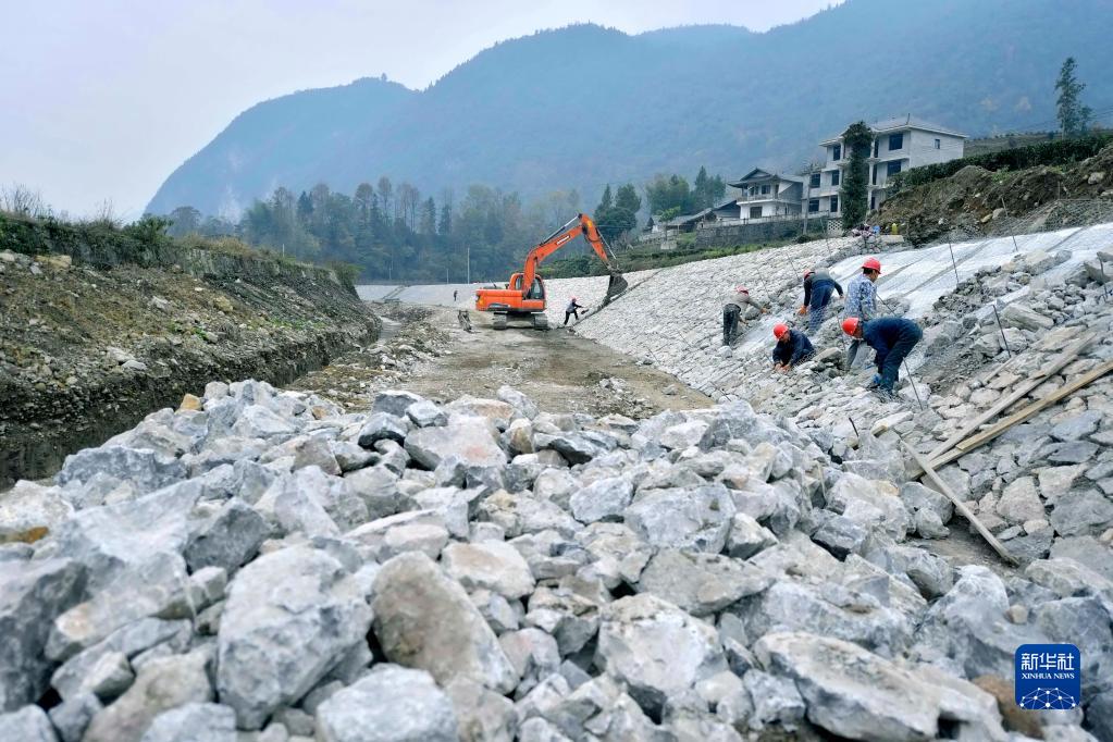 12月9日,工人在湖北省宣恩縣椒園鎮水田壩村修建河堤。
