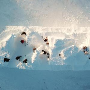 12月8日,雪雕師在哈爾濱太陽島雪博會園區創作雪雕作品(無人機照片)。