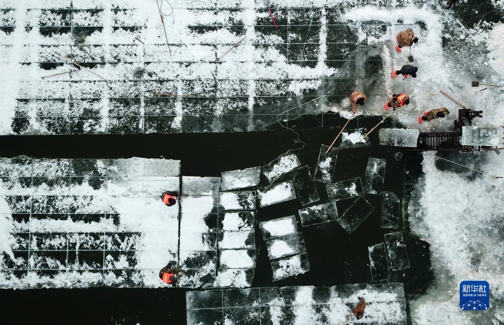 12月7日,工人在松花江哈爾濱段冰封的江面上進行采冰作業(無人機照片)。