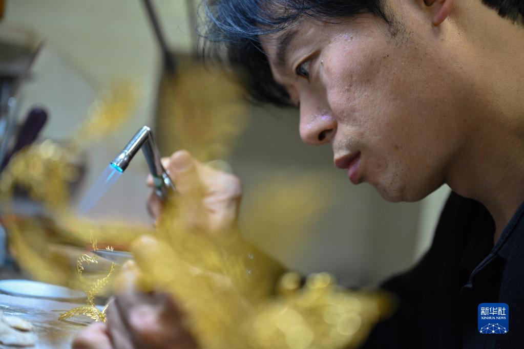 12月8日,創業青年黃飛達在上塘村的個人手工作坊內用噴槍燒熔鍍金銀器。
