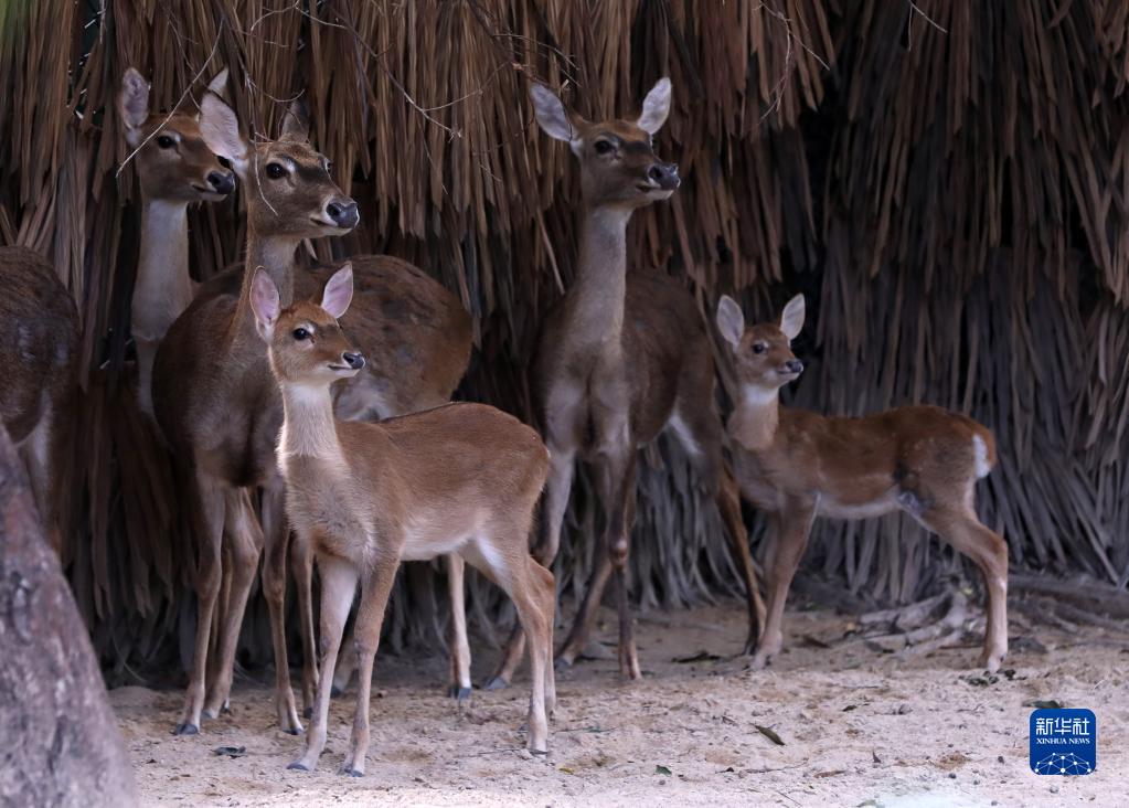 12月9日,兩頭海南坡鹿寶寶與幾頭成年坡鹿在一起。