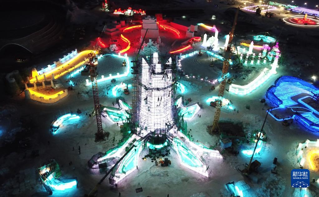 哈爾濱冰雪大世界主塔“冰雪之冠”封頂